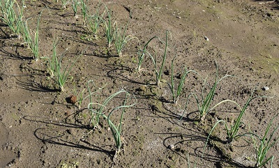 株元でつながっている種球を1片ごとに分けておきます。なお種球の外側の茶色の皮は無理にはがす必要はありません。株間10~15cm、深さ約5cmの植穴に2片ずつ尖っている方を上にして先端がわずかに見える程度に埋め込むように植えつけます。