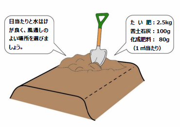 日当たりと水はけが良く、風通しの良い場所が適します。1㎡当たり、たい肥2.5kg、苦土石灰100g、化成肥料80gを施し、良く耕しておきます。