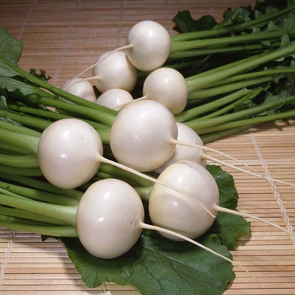 福岡市周辺で育てられた在来種。寒さに強く育てやすく、冬から早春にかけて収穫する中カブ品種。根は豊円形で肉質ち密、甘みもあっておいしく、漬物や煮物として利用されます。