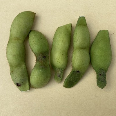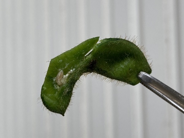 エダマメの病気・害虫・生理障害 小 大 文字サイズ カメムシ類 害虫 【カメムシ類】 花が咲いて莢がふくらんできた頃に多発する害虫。吸汁により莢の肥大が止まり、また変色した不味い豆となります。顕著な食害痕がないので油断していると生育不良で全滅することもあります。日頃からよく観察して見つけたら捕殺します。 赤黒い点がカメムシの吸汁痕で、その部分のマメは肥大していないのが分かると思います。 ダイズサヤタマバエ 害虫 【ダイズサヤタマバエ】 ハエの仲間で幼虫(ウジムシ)が莢の中の豆を食べ、充実しないまま変形した莢になります。晩生品種や夏まき秋どり栽培など開花期が7月~9月となる栽培では防虫ネットの利用や、花が終わった頃の農薬による防除が有効です。