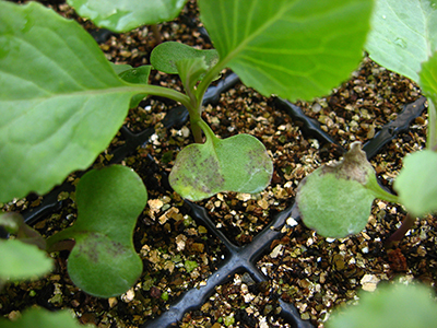 キャベツの病気・害虫・生理障害 小 大 文字サイズ 尻腐れ病・株腐れ病 病気 【尻腐れ病・株腐れ病】 初夏から秋どり栽培で雨の多い年に多発する病気。病原菌は被害茎葉と一緒に土中に残るので連作は避けます。排水対策が重要です。 根こぶ病 病気 【根こぶ病】 日中のしおれが激しく、夕方には回復しますが生育が止まります。引き抜くと根にこぶができており、放置するとこぶは破裂し、その後枯れます。水はけの良くない畑に発生しやすく、以前にも同様の症状が出た畑では、高うねにするなどの対策が必要です。連作障害の一種ですので、アブラナ科野菜の連作は避けましょう。 黒腐れ病 病気 【黒腐れ病】 雨の多い時に発生し、葉の周辺から黄色くなってきます。台風などの強い風雨によって土の中にいる病原菌がはね返り感染し、病気に侵された葉は二次感染の伝染源になります。病気に罹った株は早目に畑から持ち出し処分します。 黒斑細菌病 病気 【黒斑細菌病】 春と秋の比較的温暖で雨の多い時期に発生しやすい病気です。アブラナ科野菜全般に発生しますので発病株は早目に処分し、連作を避けることが後作のためには有効です。また畑の水はけを良くして、軟弱に育てないことも大事です。 菌核病 病気 【菌核病】 強い雨などで土のはね返りなどが葉と葉の間に入って、湿度の高い状態が続くと感染するカビの病気で、最終的には黒い塊ができます。肥料をやり過ぎて軟弱に育った株に発生しやすいので注意が必要です。発生した株は汚染源になるので早急に引き抜き、畑以外の場所で処分します。 べと病 病気 【べと病】 発病した葉の裏を見ると灰色のカビが生えています。気温が15~20℃位で多湿条件が重なると発生しやすく、カビから胞子が飛び周囲に伝染して広がっていきます。育苗中は夕方以降の水やりを控え、陽当たりと風通しを良くしましょう。 ヨトウムシ類 害虫 【ヨトウムシ類】 成虫が卵をまとまって生み落とし、孵化した幼虫が集団で食害を始めます。短期間に葉脈を残して食べつくされることもあるので見つけ次第早急に駆除する必要があります。 ハイマダラノメイガ・ダイコンシンクイムシ 害虫 【ハイマダラノメイガ・ダイコンシンクイムシ】 やわらかい幼苗時に幼虫が生長点を食害して侵入し、芯がなくなった状態になり、回復しません。株が大きくなると被害はないので、特に注意が必要な7月下旬から8月下旬までは防虫ネットなどで利用して防ぐことは重要。 コナガ 害虫 【コナガ】 成虫は肌色の小さな蛾。幼虫は葉の裏のやわらかい部分を食害します。特に気温の高い時期に多く発生するので、夏まき栽培では生育初期に防虫ネットなどを使って防ぎます。 カブラヤガ・ネキリムシ 害虫 【カブラヤガ・ネキリムシ】 夜の間に活動して株元をかじり、苗を倒して枯らせる蛾の幼虫が原因です。被害に遭った株元を数cm掘れば、犯人の幼虫が見つかりますので隣の株に移動する前に見つけて捕殺処分します。軟弱な苗をねらう傾向にあるので、葉枚数の多いしっかりとした苗を作ることも予防になります。 カルシウム欠乏症 生理障害 【カルシウム欠乏症】 急激に育って肥料をうまく吸えなかった場合や暑さで発症するケースが多い生理障害で、外葉や内葉に枯れた葉が混じります。 生育初期の乾燥や大雨によって根が十分に発達してない場合、その後の天候回復によって一気に成長した時などに頻発します。ただ発症してからの改善方法はないので、生育途中に乾燥が激しい場合は適時水やりをし、大雨で根が傷んでいると思われる場合は中耕して根の回復を促すなどが予防策として効果的です。 また暑すぎる時期の収穫にならないようタネまきのタイミングも調整しましょう。 ホウ素欠乏症 生理障害 【ホウ素欠乏症】 春の気温が急激に上昇する時期に肥料吸収のバランスが崩れて発生しやすく、芯の中心部が縦長に変色します。 落ち葉たい肥などを用いての畑の土づくり、有機質肥料を中心とした栽培などが発生の抑制に有効です。 内部黒変症 生理障害 【内部黒変症】 冬期に内部の水滴が寒さによって氷結と解凍を繰り返した際、水滴付近の内葉が傷むことで発生する凍害痕と考えられています。 畑の乾燥や急激な気温低下は発生を助長することもあるので、適時のかん水やベタ掛けなどの保温資材の利用などが予防に有効です。また肥料のやり過ぎも発生を助長するので注意しましょう。