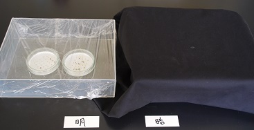 同様に“ちりめん青しそ”を使ってシャーレにタネをまいて水を与え、一方は黒い布で暗くして光を遮り、もう一方はラップで光を通すようにしました。