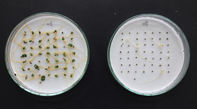 ご覧のように写真左側シャーレの明条件区ではしっかり発芽していますが、右側シャーレの暗条件ではほとんど発芽していません。