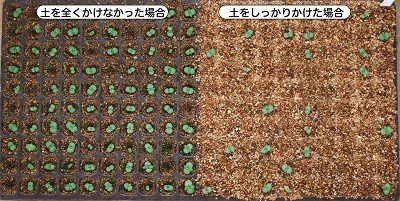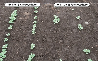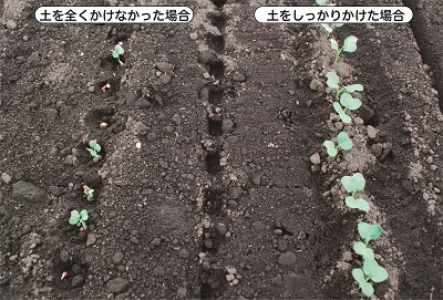 実際の畑でタネをまいた時に土をかけなかった条件としっかりと覆土した条件とを比較してみました。