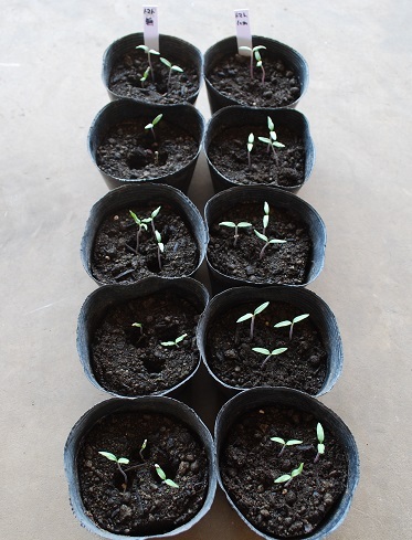 トマトも嫌光性種子に含まれます。左は植穴にタネをまいただけで覆土はしなかったポット、右は覆土をしたポットです。いずれも1ポットに3粒ずつタネをまきましたが、覆土をした方はほぼ発芽しているのに対して、覆土しなかった方の発芽はまばらです。
