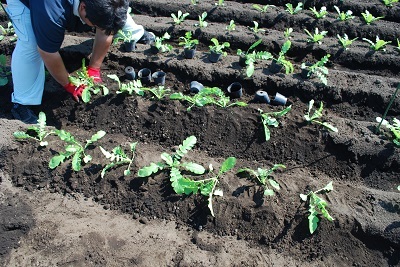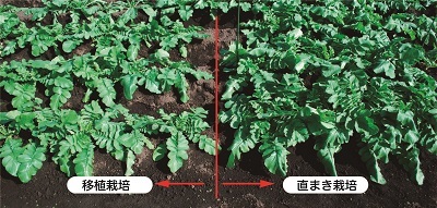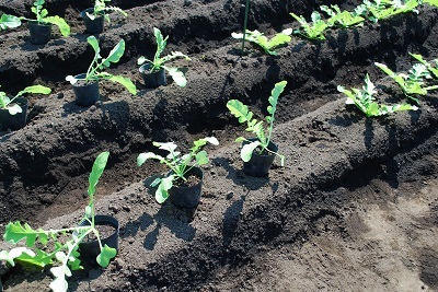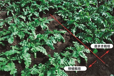 植え付け時の様子。右上は比較の直播き栽培のダイコン。