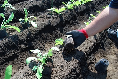 ポット苗を植え付けている様子。根はポット全体に行き渡っています。