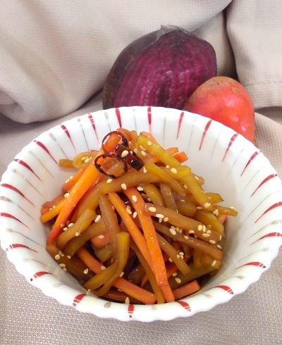 砂糖を使わずに素材のビーツの甘さと、シャキッとした歯ごたえを活かしたきんぴらです。食感をよくするために、ニンジンとビーツの厚さや炒める時間にこだわりました。また、ニンジンとビーツの長さを揃えることで、食べやすくなります。彩りが良く、冷めてもおいしいのでお弁当のおかずにも最適です。