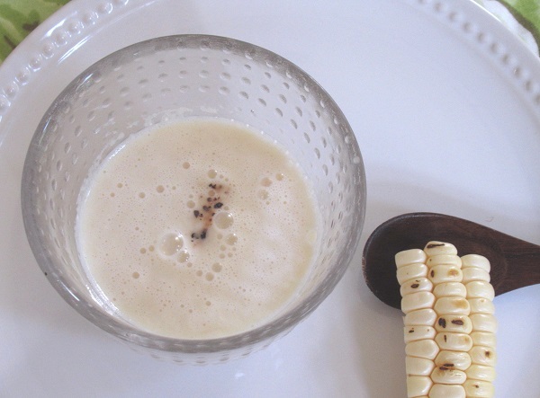 スーパーホワイトコーン1本は、実をこそげ取る。牛乳と共に、なめらかになるまでミキサーにかけ、ザルで漉して皮を取り除く。