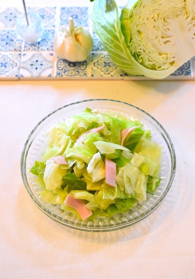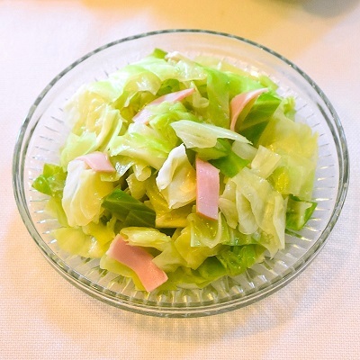初恋キャベツは1㎝幅×3~4㎝長さに切る。ハムは半分に切り、1㎝幅に切る。