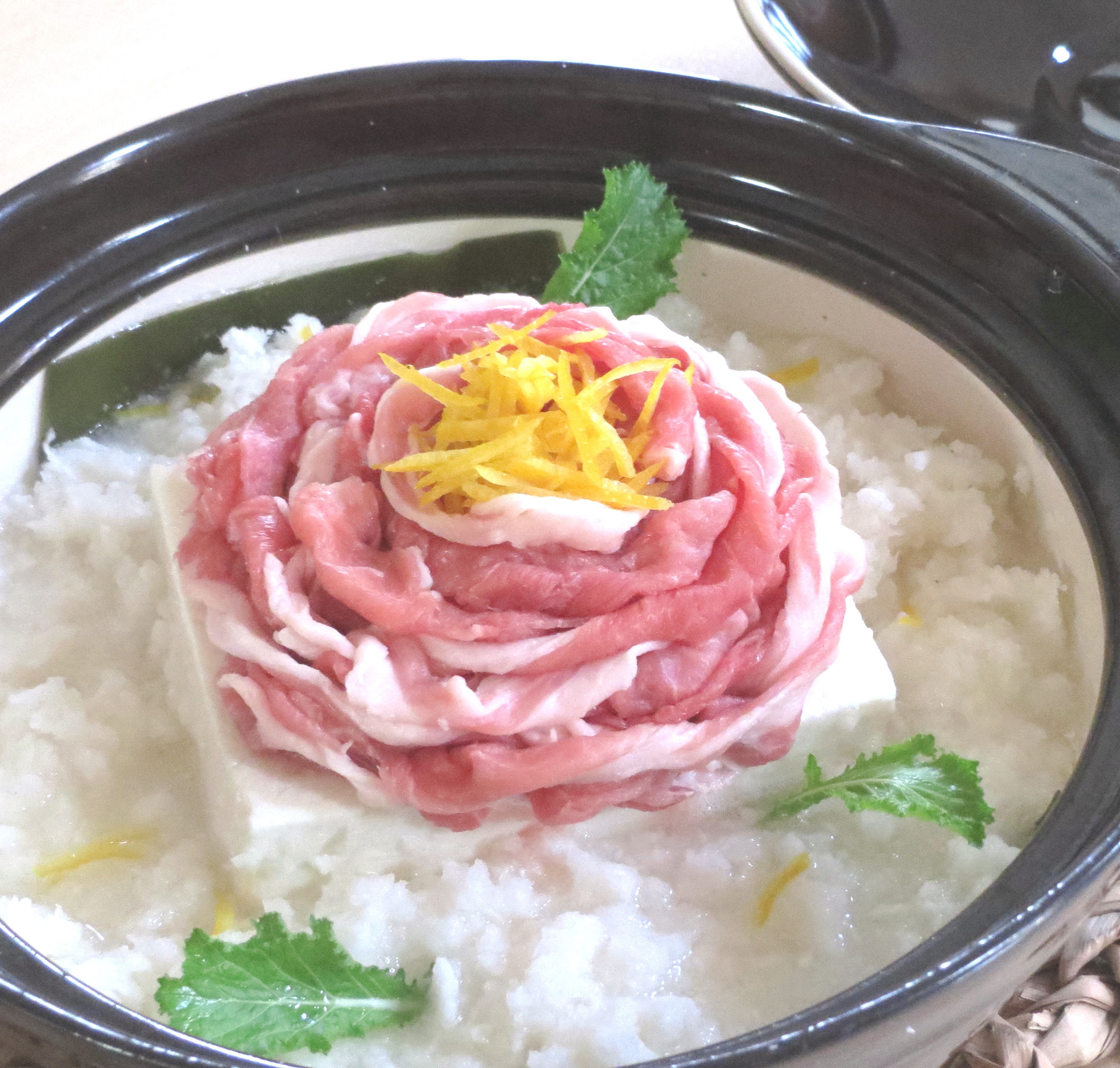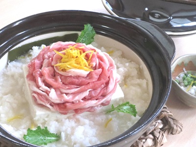 昆布は水で濡らして鍋底に敷き、豆腐をのせる。豆腐の上に、しゃぶしゃぶ用豚肉をくるくると巻いて花の形を作り、柚子の皮の千切りを飾る。周りに①を入れ、水を辛味大根の上まで張り、日本酒を加える。