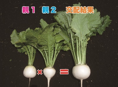左の2種類のカブを両親として掛け合わせると、右のように両親より生育旺盛で大きなカブとなります。