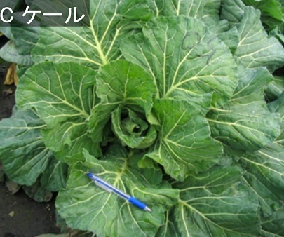 結球するキャベツに対してハボタンは殆ど結球せず、ケールも葉が中心に小さく抱合しているのが観察される程度です(図A-C)。