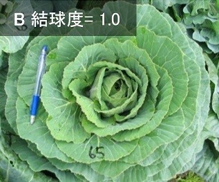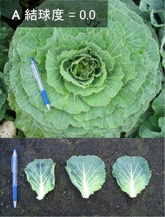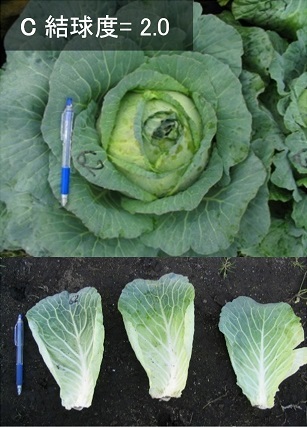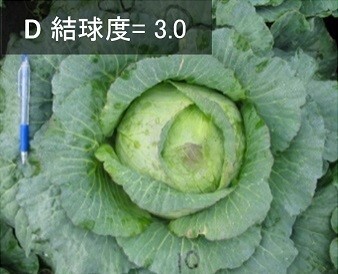 0:結球していない、1:中心部のみ小さく結球、2:弱く結球し球の頭が開いている、3:球の頭の重なりが不完全な結球、4:完全結球とし、それぞれの評点の中間的なものを0.5、1.5、2.5、3.5とする9段階で評価してみました(下の写真)。