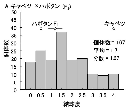 すなわち結球性は、単一遺伝子の突然変異により獲得された形質では無く、複数の遺伝変異の集積により獲得された形質であると考えられ、結球性は量的形質であるという結論になります。