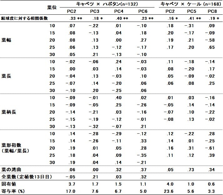 さらに、主成分分析により抽出された各主成分における各個体の主成分得点と結球度との相関分析を行いました(表中の結球度に対する相関係数)。なお表には結球度と統計的に有意な相関のみられた主成分(PC)のみを示しました。