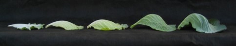 キャベツ×ハボタンならびにキャベツ×ケール各F2集団について、葉に関わる発育形質を詳細に調査し、これら発育形質の主成分分析を行いました。調査項目は第10葉位から第30葉位まで5葉位ごとの葉幅、葉長、葉柄長、葉形指数(葉幅/葉長)と、葉の湾曲(各個体の結球度が定まった後、内側の葉から2cm以上離れた葉位の葉から低方向に3葉位分の葉を 葉長/葉の先端と付け根の最短距離 という値で算出)と全葉数(計測可能な定植後13日目の、葉長が5mm以上の葉の枚数)としました。