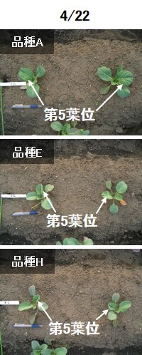 4月22日の様子です。早生の品種Aの方が品種Eや品種Hよりもはじめから葉が大きいことが分かります。第5葉位 というように葉位をそろえて比較すると差がよく分かります。