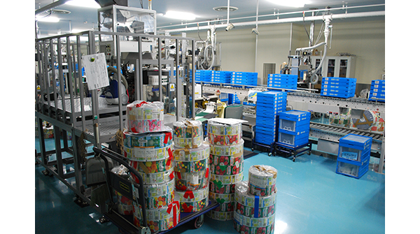 充填された商品パケージはラインを流れて集積室に届けられます。