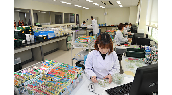 商品管理部で精選され、自動倉庫で保存してある種子を出庫前に発芽検定にかけ、規定値に合格していることが確認された種子が自動倉庫から運び出されてきます。