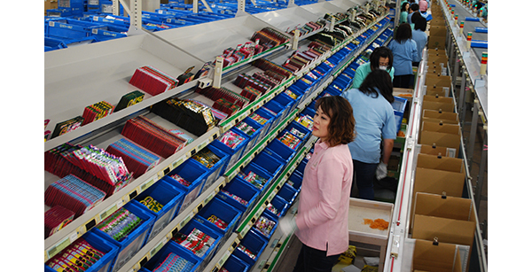 その日に発送予定のお客様分の荷物を完成させるためには、わずかの時間ロスも許されません。段ボールの流れをスムーズにしてピッキング処理能力を上げるために、様々な工夫がなされています。例えばその日に必要となる商品を充分量商品棚へ供給しておくことは基本です。