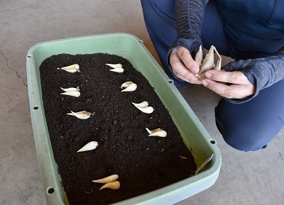 株元でつながっている種球を1片ごとに分けておきます。なお種球の外側の茶色の皮は無理にはがす必要はありません。株間10~15cm、深さ約5cmの植穴に2片ずつ尖っている方を上にして先端がわずかに見える程度に埋め込むように植えつけます。