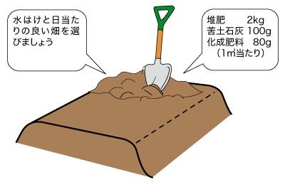 カリフラワーは乾燥には強く過湿には弱いので、排水の良い畑を選んで作りましょう。また他のアブラナ科野菜との連作は避けましょう。畑にはあらかじめ1㎡当たり堆肥2kg、苦土石灰100g、化成肥料80gを施し、良く耕しておきます。幅120cm、うねの高さは15cm位が適当ですが、排水の悪い畑では水はけが良くなるように少し高めにすると良いでしょう。
