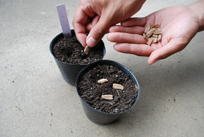 直接畑にタネをまくこともできますが、通常ポットにまいて苗を育てます。発芽適温は地面の温度で25~30℃ですから、気温が比較的高くなってからまきましょう。直径10~12cmのポットに市販の育苗培土をつめ、深さ2cm位の深さにタネをまきます。