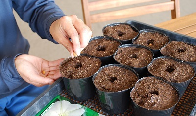 発芽適温が25℃前後ですので、暖かくなってからまきます。タネは直接花壇にまきます。深さ1cm位の深さに1カ所2~3粒ずつタネをまき、しっかりと水をやります。