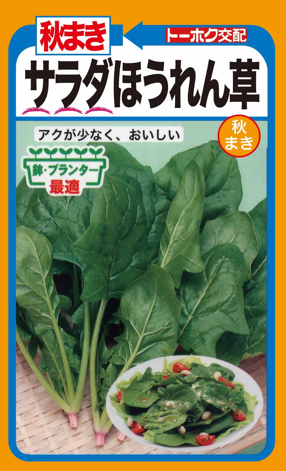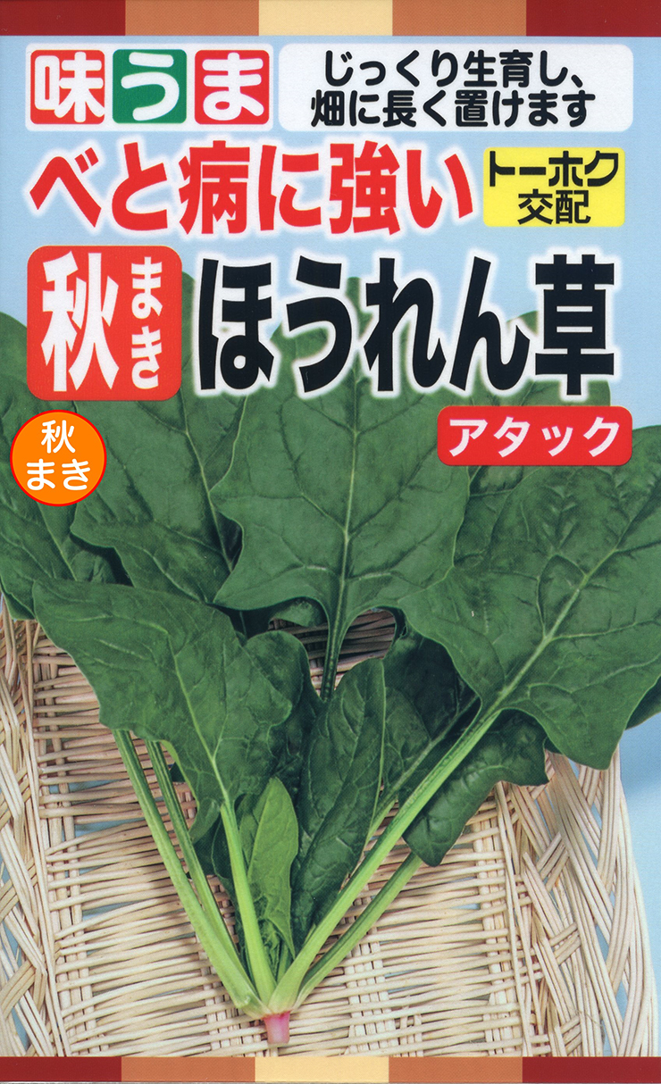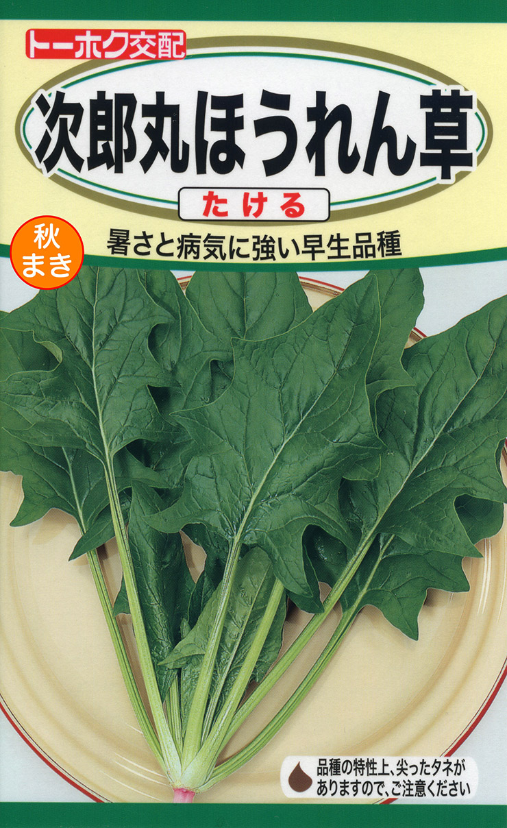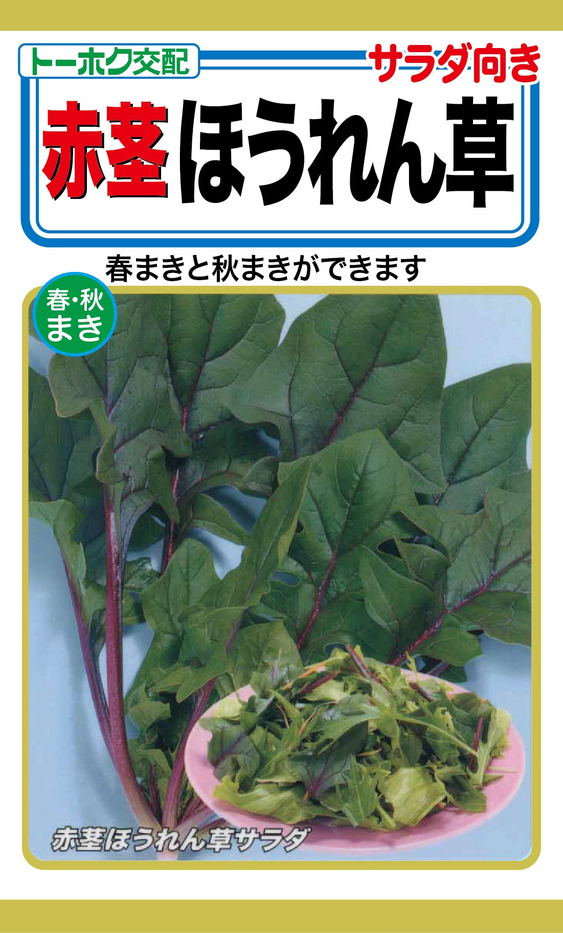 | 根も鮮やかな紅色となります。昔なじみのおいしいほうれん草の味を楽しめます。 | 暑さや病気強く、生育旺盛な早生品種。生育スピードがありやわらかく美味しい | 耐病性が極めて高く初心者にも作りやすい。葉は濃緑肉厚で畑に長く置けます | 立性で葉のからみが少なく、収穫時のロスも少ないので直売所出荷にも好適 | 葉肉が厚く、株張りよく収量が見込めます。寒さにも強く畑に長く置けます | ほうれん草の大敵べと病に強く、生育もゆっくりですから安心して栽培できます。 | 寒さに当ると格段に甘さが増す寒締め系。秋のうちに株を作ることがポイント | 切れ込み少なく丸みのある肉厚葉。西洋種ですがアクは少なく食べやすい | 西洋種ですがやや葉先はとがり、ちぢみ少なく大葉で収量の出るタイプ | やわらかく、アクの少ない美味しいほうれん草。生でサラダなどに向いています。 | 鮮紅色の葉で調理の彩りなどに重宝します。 | シュウ酸成分70%オフでサラダに最適。また下茹で不要で使える便利さも。 |