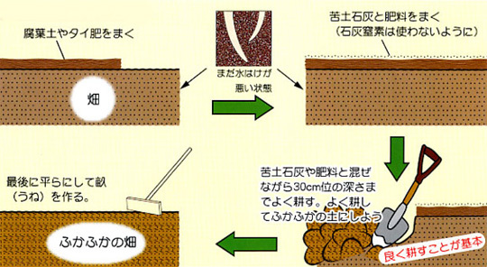 土が酸性か、アルカリ性かによって植物の生育は大きく変わってきます。そしてほとんどの野菜は 酸性土を嫌います。酸性土壌だとカルシウムやマグネシウムなどのアルカリ成分が少なくなって、有益な微生物にも影響を与えてしまいます。日本のように雨が多い国では土中のアルカリ物質が流れてしまい、土は自然と酸性になっているのが普通です。苦土石灰を施して良く耕すことが大切です。
