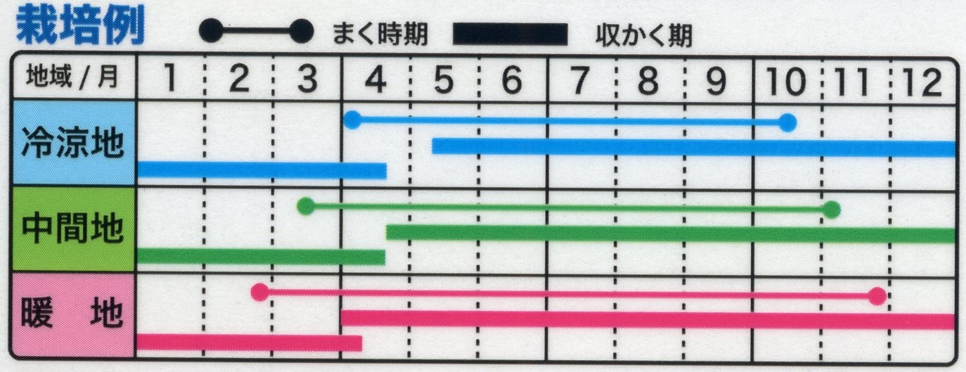 濃緑色のやわらかい葉と純白で肉厚の茎の対照的な味わいが楽しい葉野菜。つまみ菜として小さいうちから利用しでき、秋まきでは大株にして霜に当ててシャクシ菜漬にします。