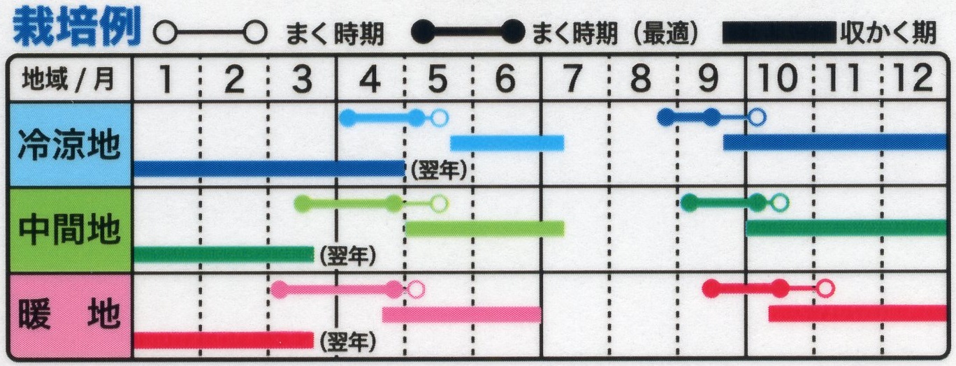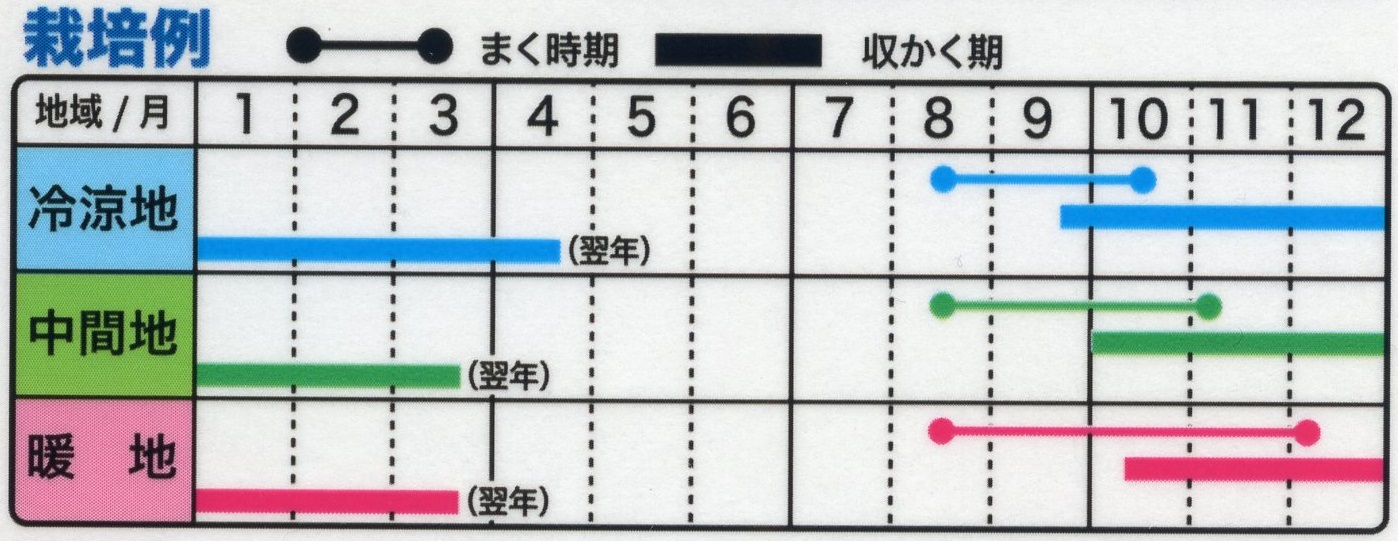 トウ立ち遅く耐暑性もあるので安心してまける春まき専用品種。葉は鮮やかな緑色でやわらかく美味しい葉質。ゆっくりとした生育で株張り良く、収量も期待できる多収タイプ。