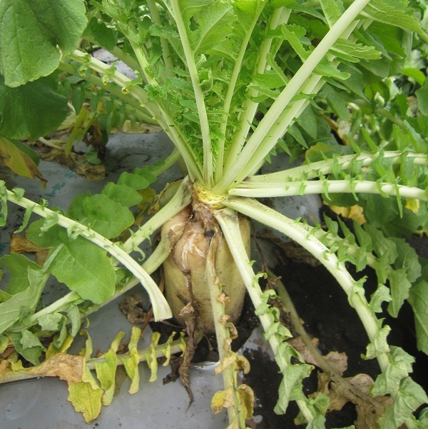 ダイコンの病気・害虫・生理障害 小 大 文字サイズ 軟腐病 病気 【軟腐病】 主に首が割れてそこからとろけ出して悪臭を放って腐敗していく病気です。葉が出来過ぎたり、排水の悪い畑で発生することが多く、台風などの風でついた傷口や害虫の食害痕などからに、泥のはね返りなどが当って感染します。元肥のチッ素成分を控えたり、発生の多い畑では連作を避けます。 キスジノミハムシ 害虫 【キスジノミハムシ】 キスジノミハムシの幼虫が生育初期の根を食害したものです。商品価値は下がりますが食べることに問題ありません。雑草や収穫せずに畑に取り残した野菜などに潜んでいる可能性があります。アブラナ科野菜の連作を避け、畑だけでなく周辺の除草を含めた管理が防除には有効です。また夏にビニールマルチなどを使って太陽熱消毒をすると土中の幼虫駆除に有効です。 成虫は約2mmで、黄色い筋状の斑があります。 岐根・又根 生理障害 【岐根・又根】 畑に施用した油かすなどの有機質肥料が充分に腐熟していない場合や化成肥料が土に馴染んでいない場合、ダイコンの根の先端が当って傷むなどして起こります。耕うんが不十分だったり、水はけの悪い畑などでもよく起こります。 ホウ素欠乏症 生理障害 【ホウ素欠乏症】 植物の生育、特に細胞壁の形成に必要なホウ素の欠乏によって引き起こされる生理障害。表皮がサメ肌状となり、その後亀裂が生じてもそのまま肥大した結果写真のようになります。気持ちの良いものではありませんが、食べることはできます。畑の肥料成分のバランスが崩れている可能性があります。堆肥などの積極的利用が有効です。