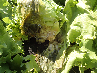 レタスの病気・害虫・生理障害 小 大 文字サイズ 軟腐病 病気 【軟腐病】 地ぎわ部が悪臭を放ってドロドロと溶けるように腐りだす病気。中耕などの作業中の傷口や害虫の食害痕に、雨などで土がはね返るなどして感染します。高温多湿の時期によく発生します。排水が良くない畑では高うねとし、被害軽減にはマルチ栽培が効果的です。