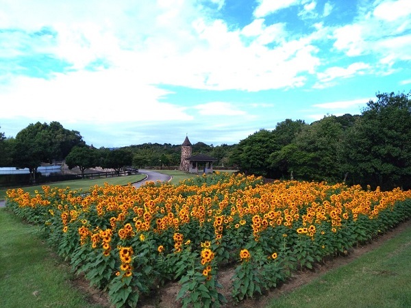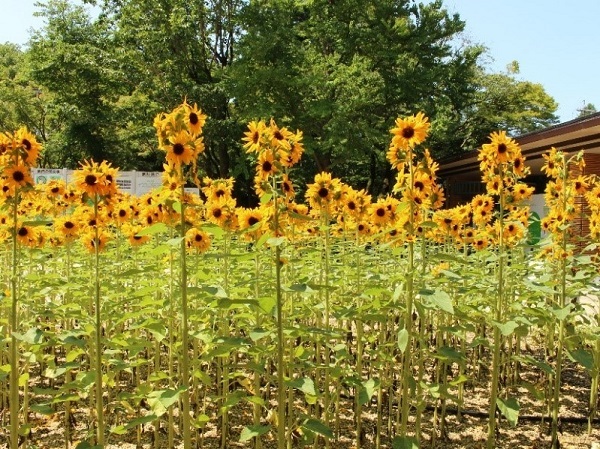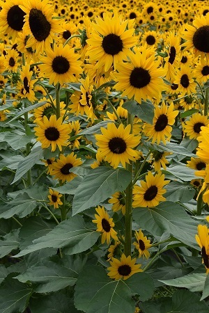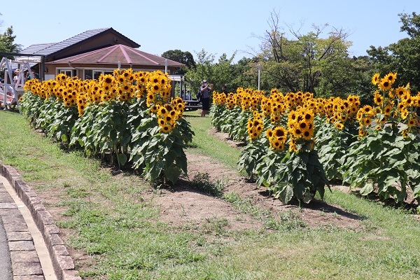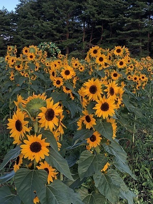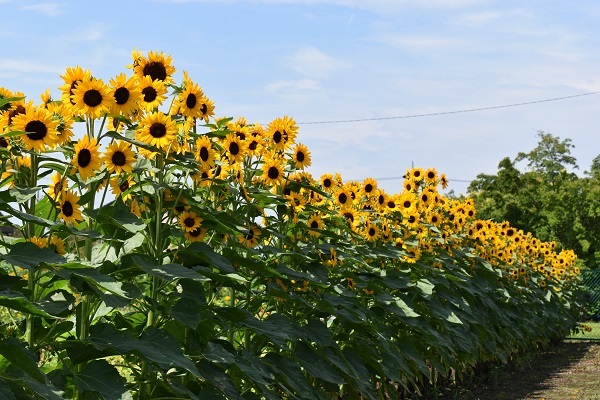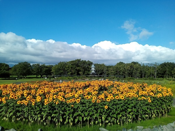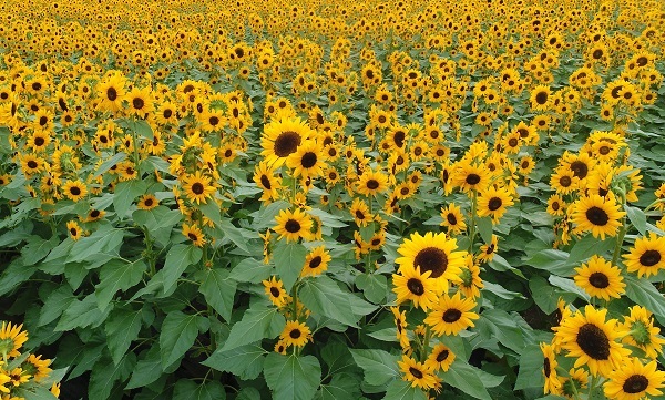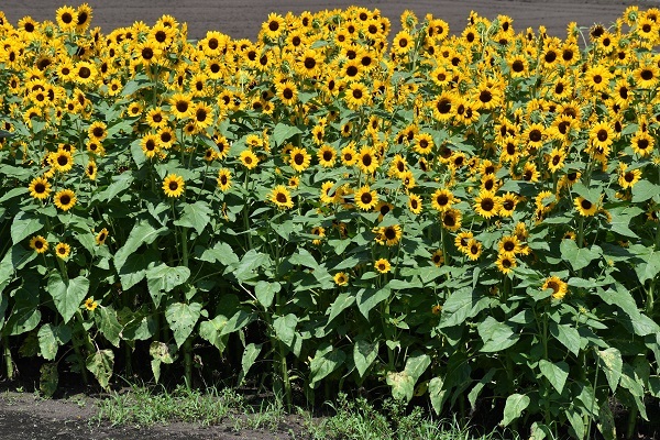 通常圧倒的な景観をつくるためにはヒマワリを集団で咲かせることになりますが、かなりの面積に相当数の株を植えないと圧倒的な景色にはなりません。