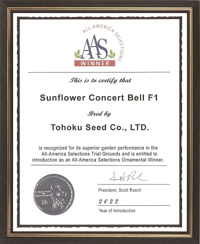コンサートベル ®は2021年にAASウィナーを受賞しました。AAS(All-America Selections:オールアメリカセレクションズ・全米審査会)とは、 アメリカおよびカナダにおける40カ所以上の大学や植物園での試作栽培によって優良品種を選定し、一般園芸愛好家に紹介・普及を行っている非営利機関で、園芸業界では最も権威のある業界団体の一つです。
