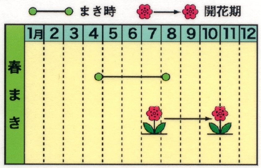 一般的には4月の下旬から5月上旬にかけては気温も25℃近くになりますが、花壇に直接タネをまく場合は遅霜の心配もなくなる5月の中下旬以降が適当でしょう。生育適温は15~35℃ですから暑さには強いですが、生育後半の気温が下がることを考えると遅まきでも8月上旬が限界です。
