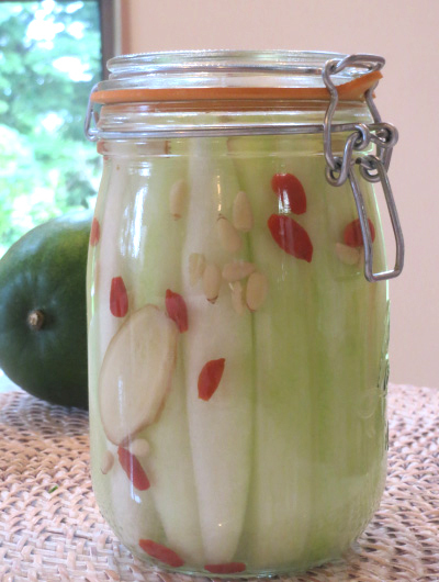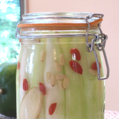 密封瓶にアルコールを吹く。①のかわいいトウガンスティック、②の生姜の薄切りを詰め、クコの実、松の実を加える。