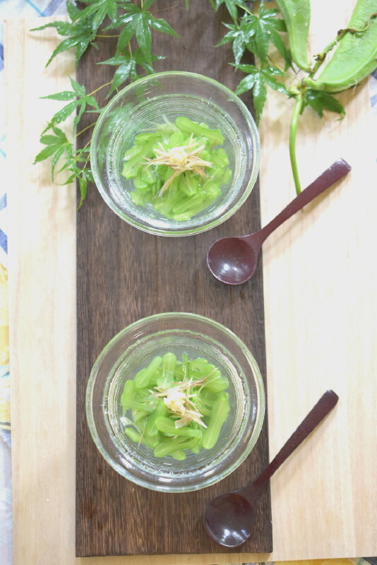 白なた豆は筋を引き、スライサーで薄くスライスする。好みの固さに塩茹でにし、冷水に取って冷やす。