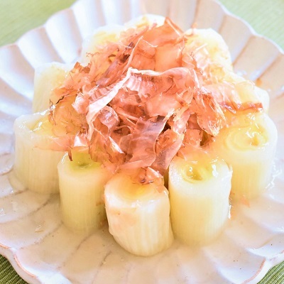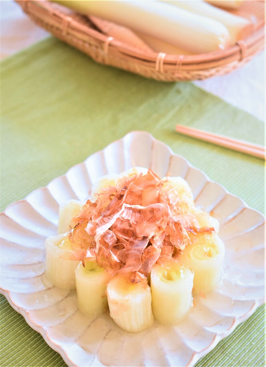 甘とろ太ねぎは3㎝長さに切り、皿に並べる。ラップをゆるくかけ、2分ほどレンジ加熱(500W)する。