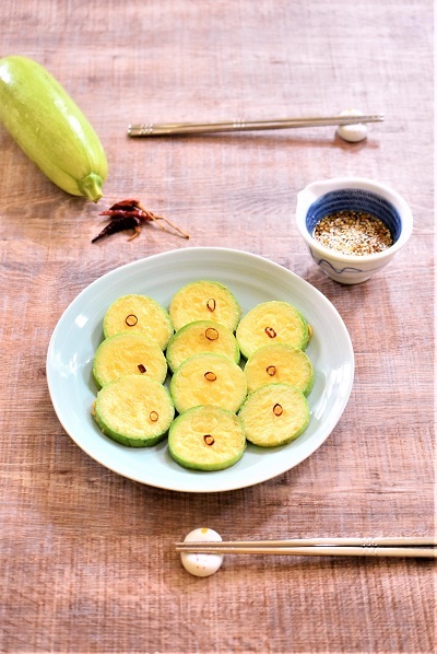 器に盛り付け、赤唐辛子の輪切りを飾る。Aを合わせたタレを添える。