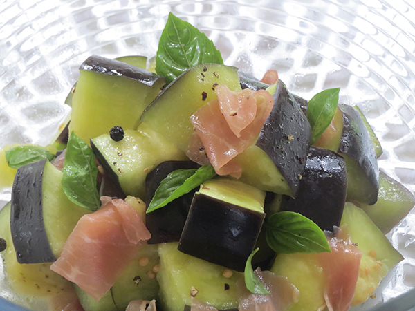 密封袋(ジプロックなど)に①のなすを入れ、EXVオリーヴオイルを加えて全体にいきわたらせる。A、塩、ブラックペッパーの潰したものを加えて混ぜ、最後に生ハムを加える。