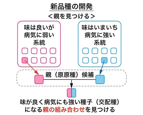 下の図はわかりやすいように単純化しましたが、例えば「味は良いのに病気に弱く育てにくい系統」を、「おいしさは満足いかないが病気に強く栽培しやすい系統」を“お見合い”させて、「おいしくて育てやすい品種」を見つけ出していると想像してください。