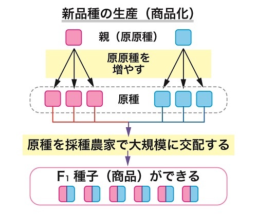 実際にはこの下の図に示すように、見出した親系統(原原種)を増殖して原種を生産し、それを用いて大量のF1種子を生産する過程が必要ですが、この話は最後に少し紹介するつもりです。