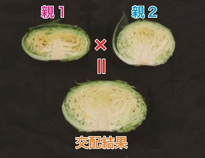 上の2種類のキャベツを両親として掛け合わせると、下のような両親より葉も良く締まった大きな玉のキャベツが収穫できます。