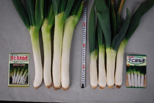 そうした中で、下仁田ねぎのような独特の風味を持つねぎを、一般の家庭菜園でも比較的簡単に栽培できるように開発したのが、写真左側のF1品種の「甘とろ太ねぎ」です。下仁田ねぎのやわらかく風味の良い特性を持つ親系統と、栽培しやすいように高温多湿でも旺盛に生育する親系統との交配によって育成されたF1品種です。越夏性に優れるだけでなく、白身の可食部分も倍近くになっています。