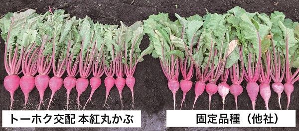 まずは赤カブについて。左はF1品種(トーホク交配 本紅丸かぶ)で、右は固定品種(他社)です。固定品種は色や大きさにばらつきがあるのに対して、F1品種はたいへん良く揃っています。