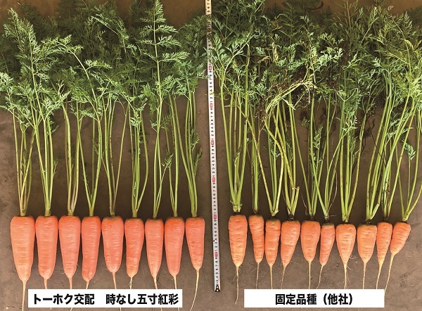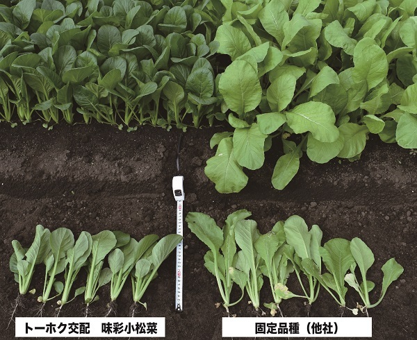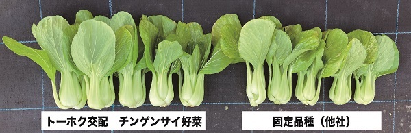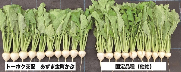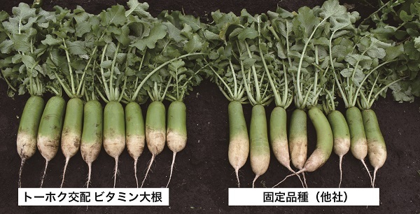 もう一つは大根です。左のF1品種(トーホク交配 ビタミン大根)は右の固定品種(他社)に比べてよく揃って間違いがないことがお判りでしょう。