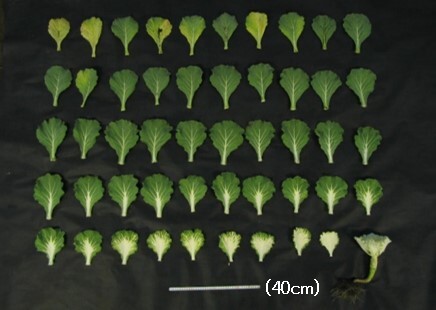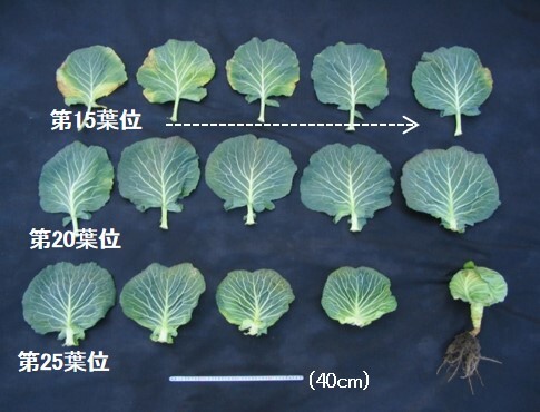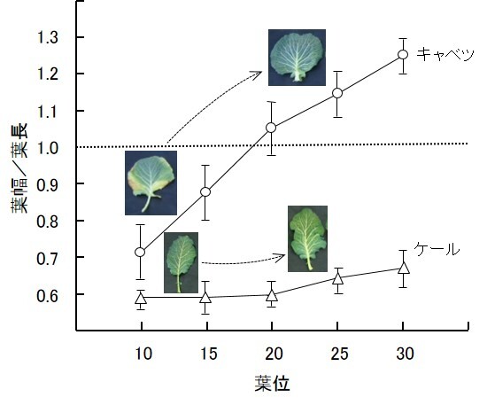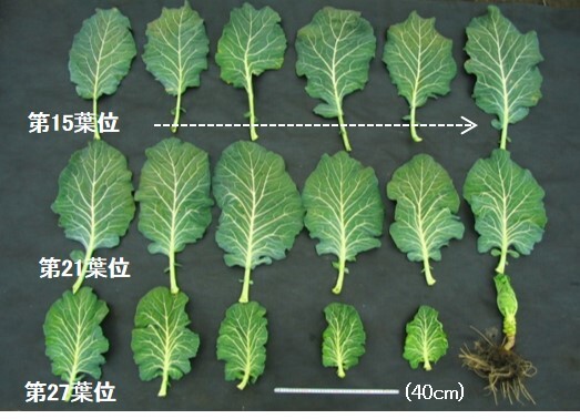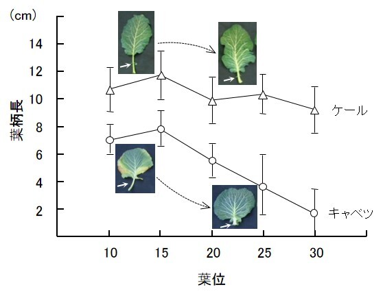 キャベツの葉は葉位が高くなるにつれて葉柄が短くなると同時に葉身がやや幅広になることで劇的に幅広の形に“発育”していました。
